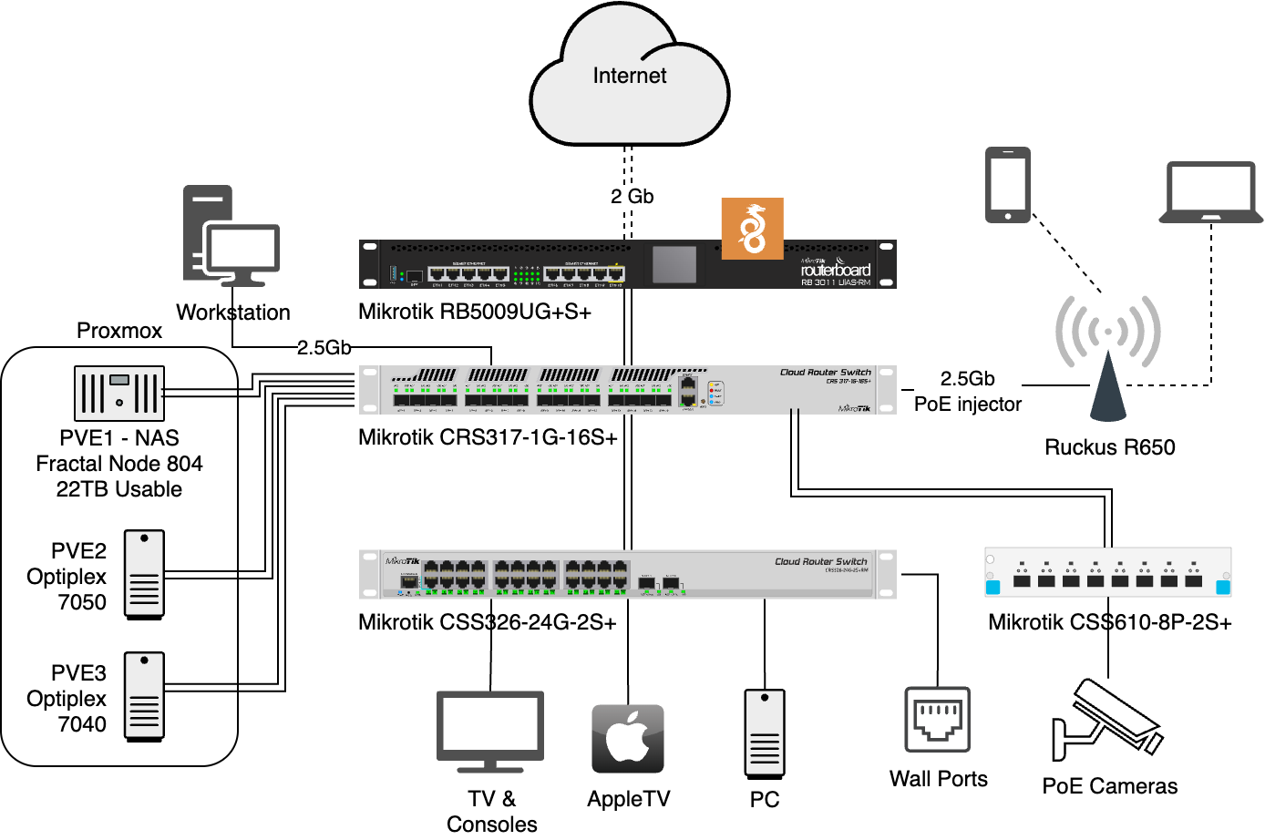 • For copper wiring stick to 2.5Gb – the power consumption of 10G over cat6 cabling isn’t worthwhile today, although it may get better in future. 5Gb apparently doesn’t save much power over 10Gb – may as well skip it and go straight to 10.